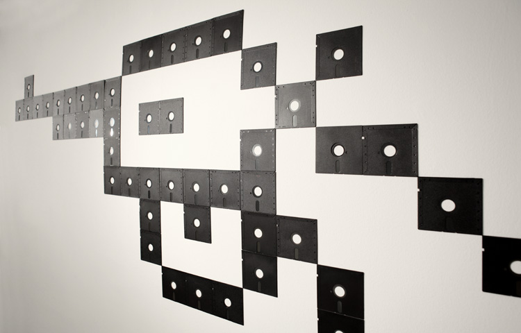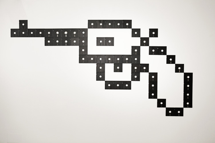La tecnología y la red consiguen atraparnos, parece que no podemos vivir sin estar conectados, como si la vida nos fuera en ello, como si nos apuntaran con una pistola obligándonos a ver el contenido generado digitalmente. Una vida que pasa por delante de nuestros ojos a través de una pantalla generada por píxles. En esta pieza los píxeles se has sustituido por diskettes de 5 1/4, aquellos primeros dispositivos de almacenamiento que se recuperan a modo de una nueva arqueología de los pasado pero reciente.