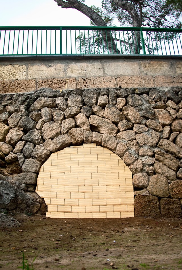 La especulación urbanística y el subsiguiente estallido de la burbuja inmobiliaria, el enriquecimiento ilícito de algunos miembros del sector público debido a concesiones urbanísticas indebidas, son parte y causa de la crisis que estamos sufriendo. El ladrillo se convirtió en el motor de una economía que se ha demostrado que carecía de cimientos, un símbolo de la cultura del “pelotazo” que el artista trata de dejar en evidencia con esta sarcástica intervención: un muro de ladrillos dorados que delimitan un espacio cerrado, sin función, ni uso, ni utilidad, donde el valor no reside en el contenido, en lo que debiera ser verdaderamente importante, sino en ese continente más ficticio que real, de tochos dorados que no de oro, que el creador plantea como una alegoría perfecta de lo que es nuestra personal e intransferible cultura del ladrillo, una pátina de engaño absoluto y reluciente, donde, obviamente, no es oro todo lo que reluce.