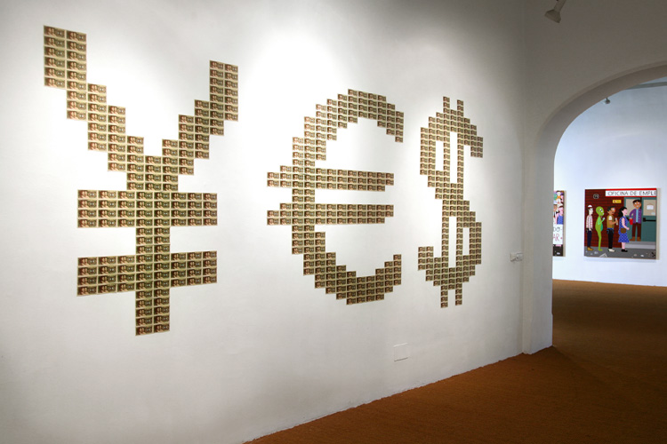 Pero estas piezas también tienen un segundo nivel de lectura que procede de los elementos empleados para su formalización: billetes de una de las monedas más devaluadas del planeta, la China, que actúan como píxeles para terminar conformando las palabras. China es un país que, como gran potencia exportadora, le interesa tener una moneda devaluada, sin embargo, no deja de resultar irónico que sea precisamente una moneda tan devaluada la que domine el comercio y, por extensión, gran parte de la economía mundial.