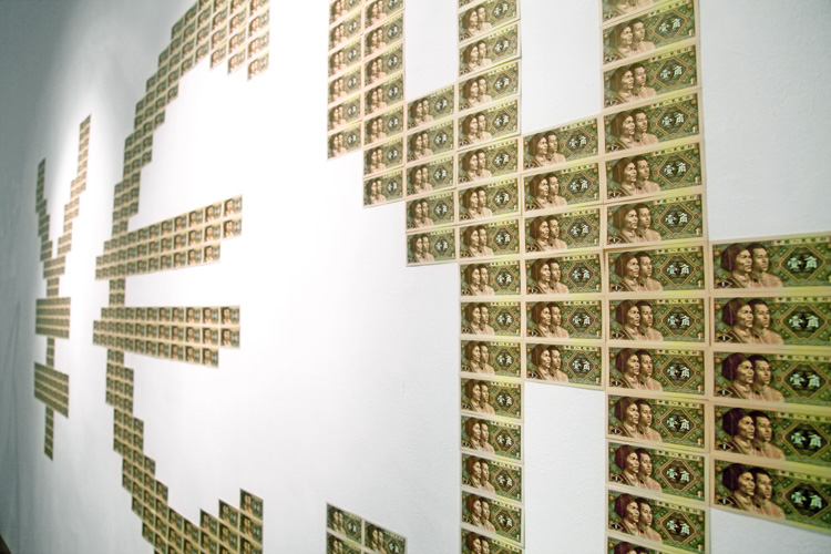 El billete con el que está realizada la pieza es de 1 jiao, la décima parte de un yuan, que es la moneda oficial China. La elección de este billete no es casual, sino que se elige con la intención clara de mostrar como la economía de un país puede dominar el consumo del mundo.