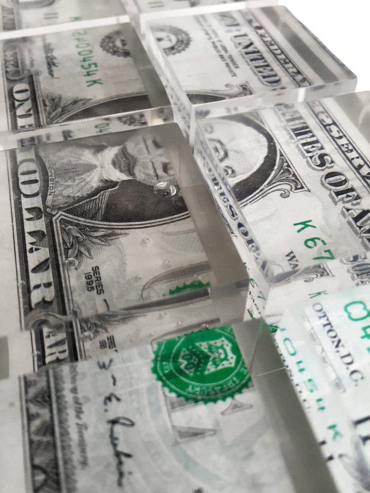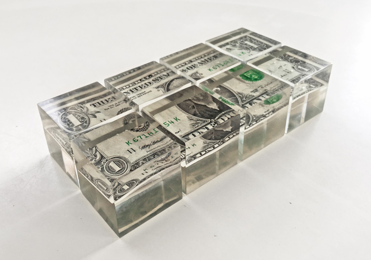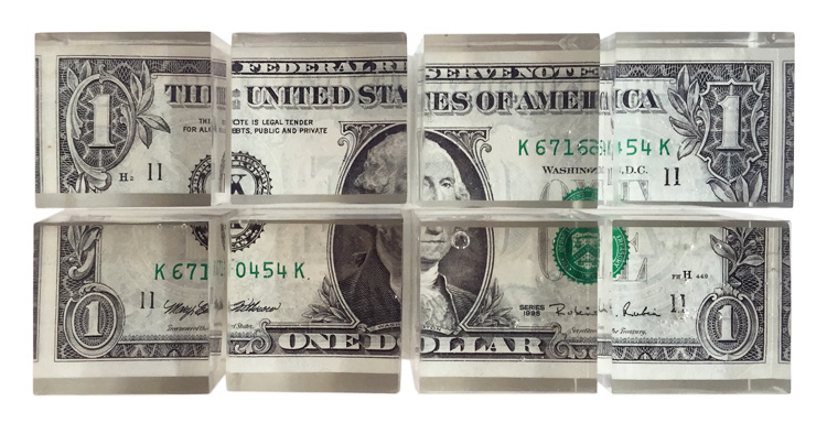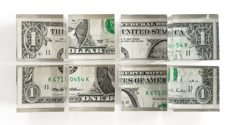 La apieza está realiza en resina trasnparente en cuyo interior se ha introducido un billete original de 1 dolar dividido en ocho partes iguales. Un pequeño puzzle que nos permite jugar a unir o a repartir, pudiendo mover los distintos cubos y apilarlos a nuestro antojo como cualquir otro juego geométrico de piezas de madera. ¿Qué haríamos nosotros si pudiéramos decidir sobre la economía mundial?