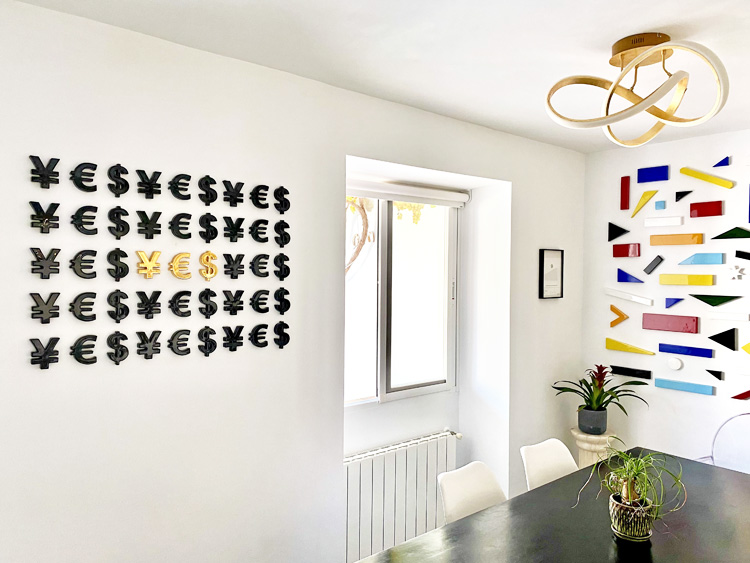El símbolo gráfico a menudo usado como una taquigrafía para el nombre de una divisa es reconocible por sus usuarios y conecta directamente con el valor del prolpio dinero.Los símbolos de las monedas más conocidas e influyentes del planeta: ¥ (Yen), € (Euro) y $ (Dolar) son usados para configurar una afirmación contundente que nos haga reflexionar sobre quién verdaderamente ostenta el poder en la actualidad, –que no es otra que la economía de mercado–. Partiendo de aquí se desarrolla ¥€$.