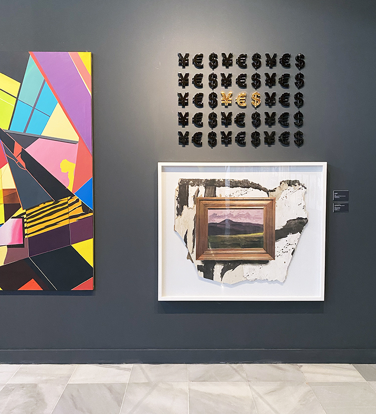 Black ¥€$ pertenece a la serie Avida Dollars en la que el uso de los diferentes símbolos monetarios presentan diferentes anagramas que nos conectan con ideas concretas. Aquí el color negro nos permite centrarnos en toda esa economía que dirige los designios de las sociedades basadas en la quema de combustibles fósiles con el petróleo a la cabeza. Un oro negro que no hace sino contaminar y degradar nuestro planeta, además de concentrar la economía en unas pocas manos.