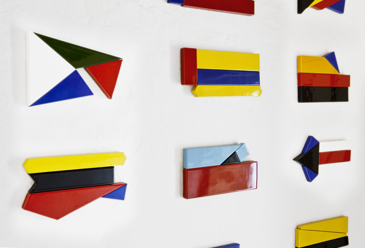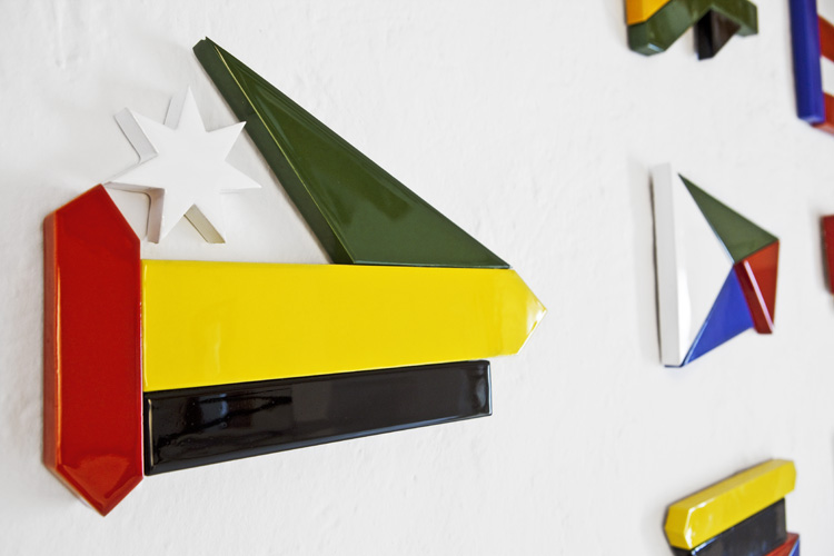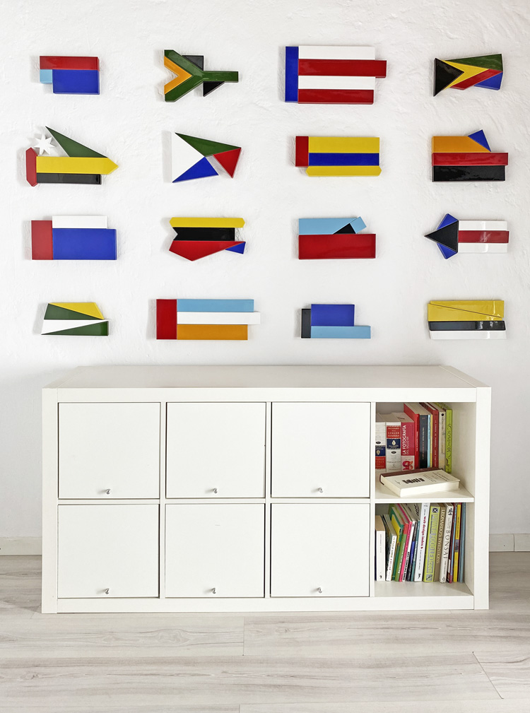 Realizadas en cerámica esmaltada, cada composición simboliza una nueva bandera realizada con partes de otras banderas, lo que configura nuevas concepciones hacia el símbolo previamente establecido. Cada composición tiene un título propio que deriva de la descripción geométrica de cada pieza que forma parte de la composición alajándonos al máximo del símbolo generado y centrándonos en la forma. Esta obra reflexiona sobre el avance actual hacia una sociedad más plural y postidentitaria.
