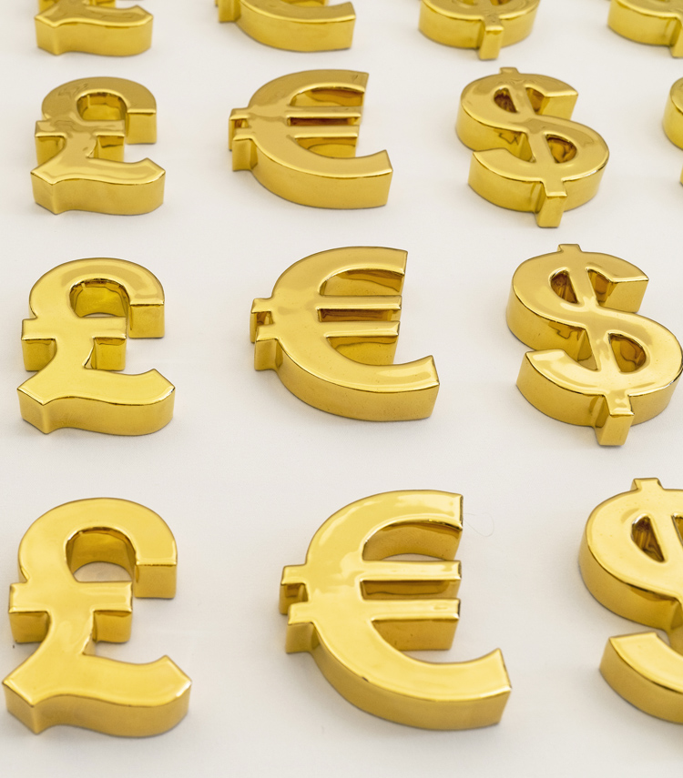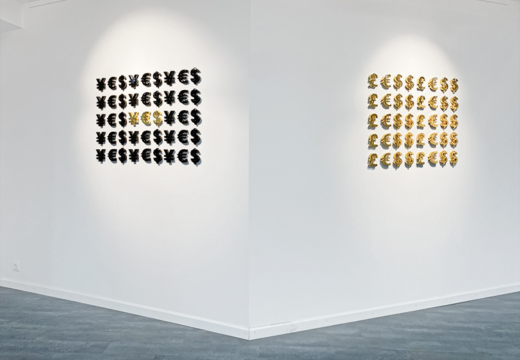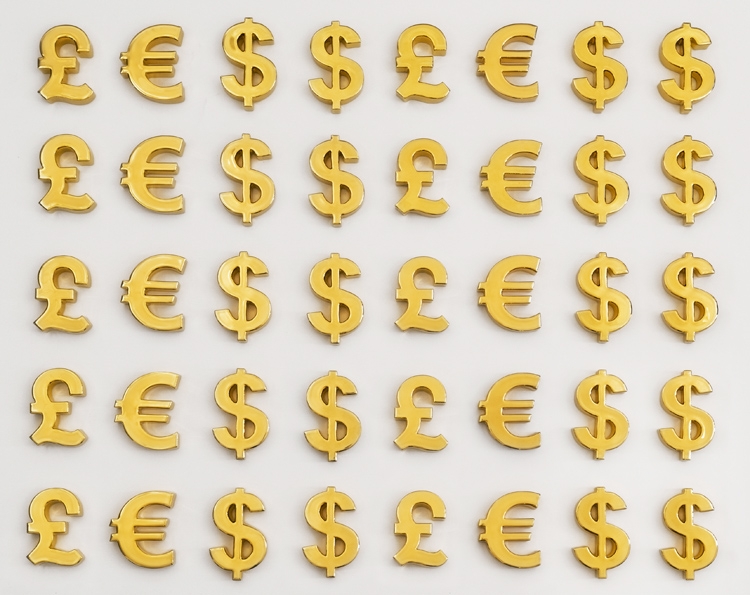 Los símbolos de las monedas más utilizadas e influyentes del planeta como el Euro, El dólar, la Lybra o el Yen se usan para formalizar la idea sobre la riqueza, los recursos, los bienes y servicions, y su repartición en la sociedad. Menos es más es una expresión conocida por ser utilizda por el arquitecto Mies Van der Dohe, originalmente referida a la arquitectura, pero que hoy se usa en todos los ámbitos.