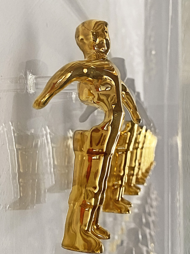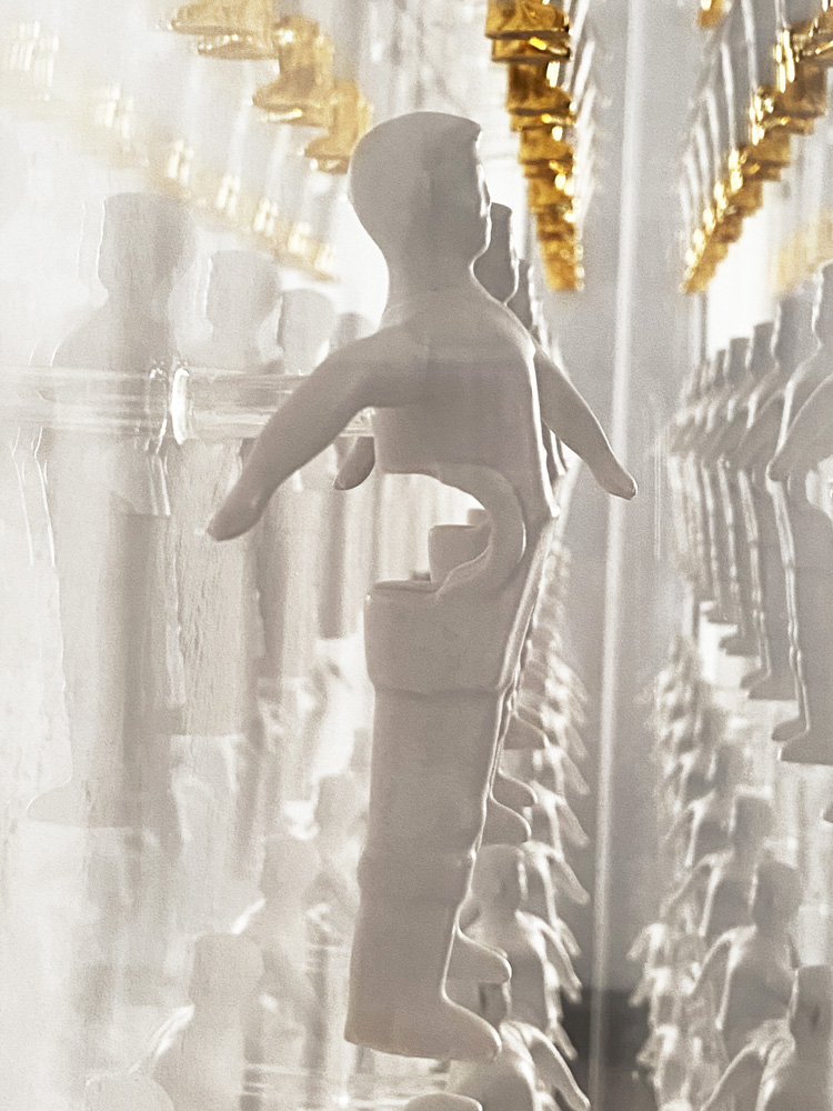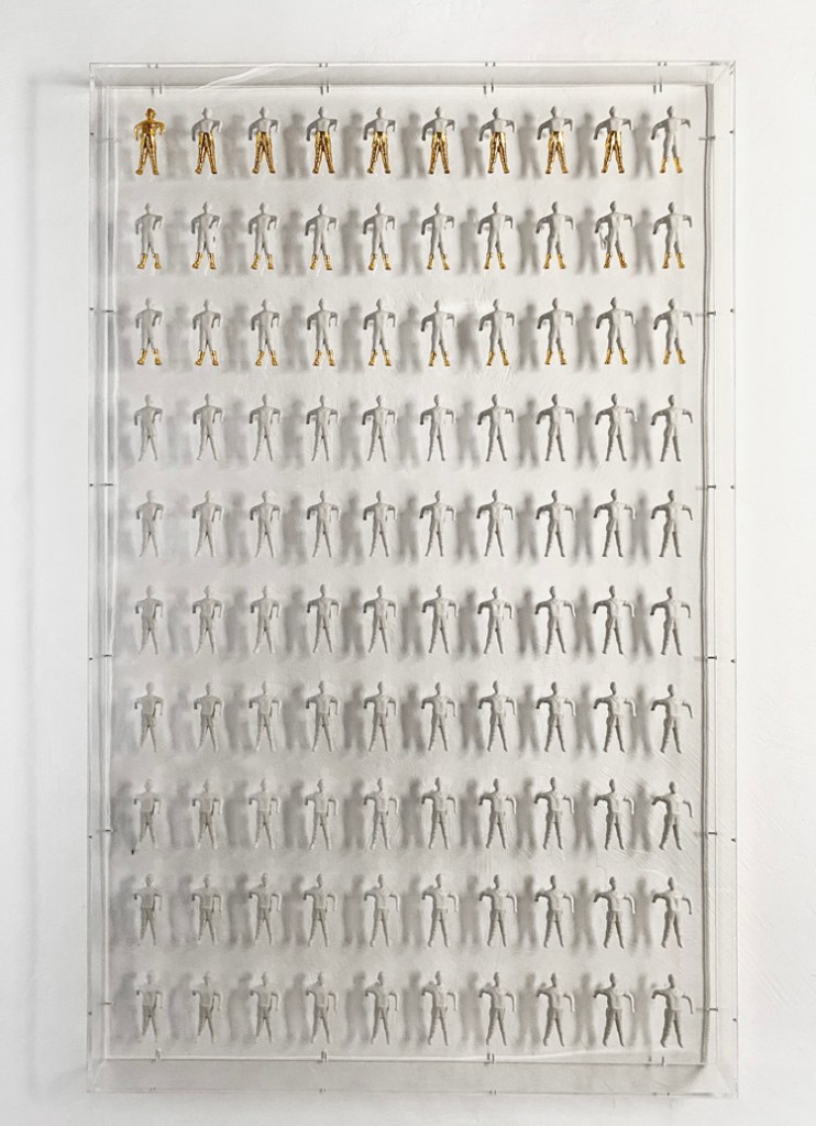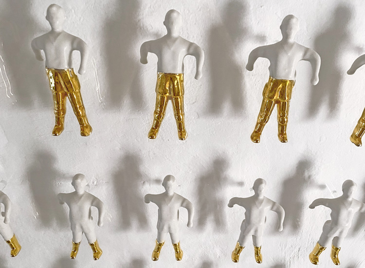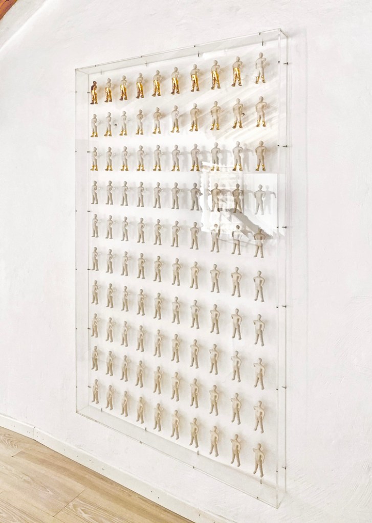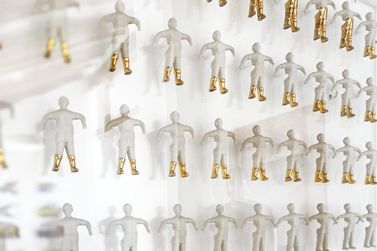 From Disparuiy to Dignity, que pertenece a la serie Fair Play está conformada por cien muñecos de futbolín iguales, todos están obtenidos del mismo molde y reproducidos en porcelana blanca, dura pero frágil, como la propia vida. Una vida configurada por las infinitas posibilidades planteadas en la propia existencia como juego dinámico de creación y destrucción, en la que lo único que nos diferencia es el artificio de una pátina de oro que nos recubre y nos sitúa dentro de una sociedad capitalista donde parece que lo único importante es nuestro poder adquisitivo. Esa riqueza que nos pone a unos por encía de otros, cuando en realidad todos somos iguales, es una distinción inventada por el ser humano contraria a la propia existencia natural. La distribución del oro sobre estas figuras humanoides hace referencia a los porcentajes de distribución de la riqueza global, es un hacer visible la desigualdad de la repartición de esa riqueza que nos separa y hace del mundo una realidad llena de disparidad, que debemos cambiar si queremos que la sociedad avance en la conquista de los derechos humanos.