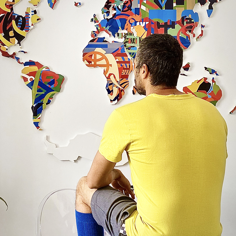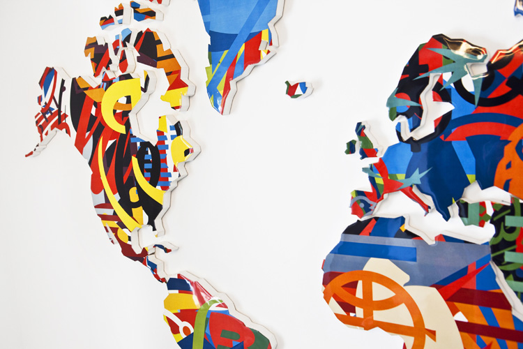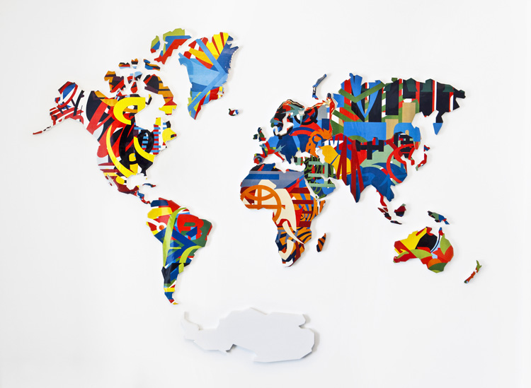 La identidad de las banderas superada por la nueva identidad corporativa nos deja un mapamundi completo, sin huecos libres por donde vislumbrar las identidades particulares de los diferentes países. Colores y figuras que se mezclan para generar una reflexión de quienes somos dentro del contesto grlobal actual.