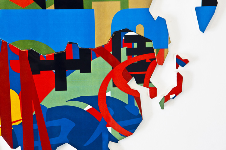 Esta pieza parte de los logotipo de las empresas y corporaciones para crear el mapa donde los continentes y los países aparecen convertidos en enormes corporaciones, un plano realizado con esa cerámica que deja patente la fragilidad de un sistema que, a modo de puzzle, configura la nueva realidad identitaria de unas naciones cada vez más alejadas del sustrato cultural que debería serles propio.