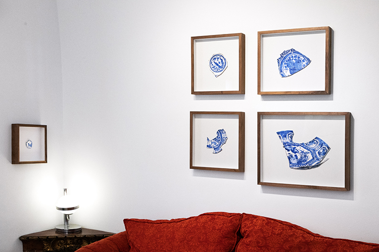 Frente a la reproducción técnica que Walter Benjamin señaló como el fin del «aura» del objeto, esta obra propone un camino inverso mediante la resistencia manual del dibujo. El ejercicio de trasladar estos fragmentos al papel no busca la mera documentación, sino que se constituye como un acto ritual. El tiempo invertido en la observación minuciosa y en el trazado de cada gradación del azul cobalto le devuelve a la pieza su singularidad perdida. De este modo, la fractura deja de ser un indicio de deterioro material para convertirse en una intención formal, desplazando el fragmento desde la vitrina estática del museo hacia el terreno de la ficción artística, donde recupera su jerarquía y su valor sagrado.