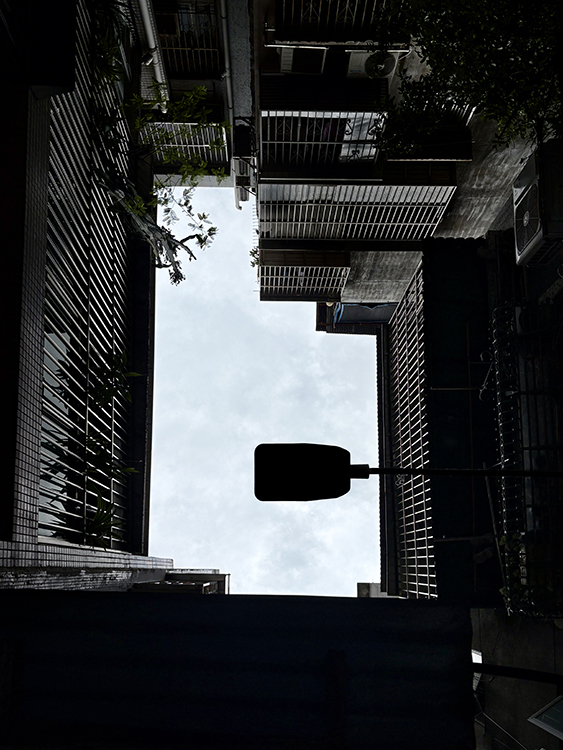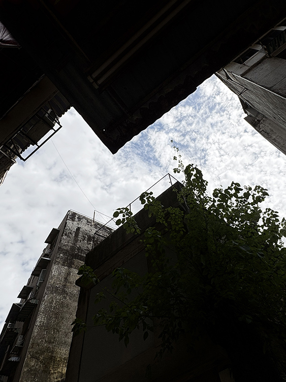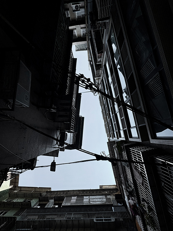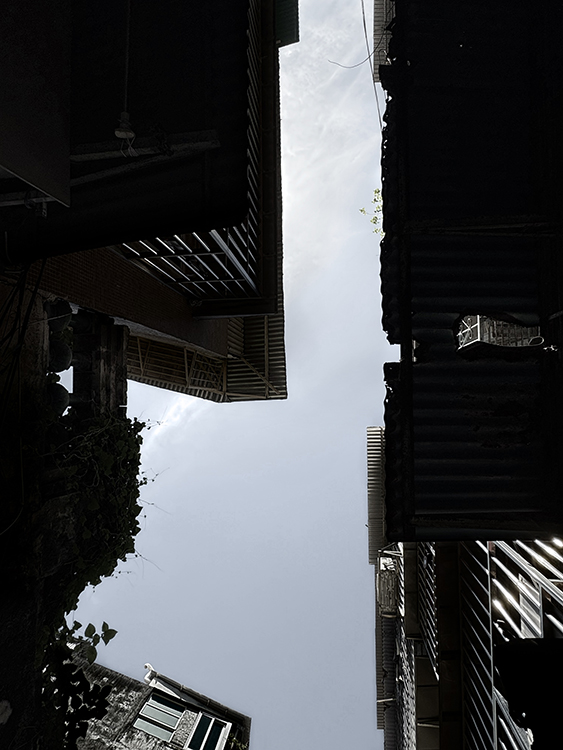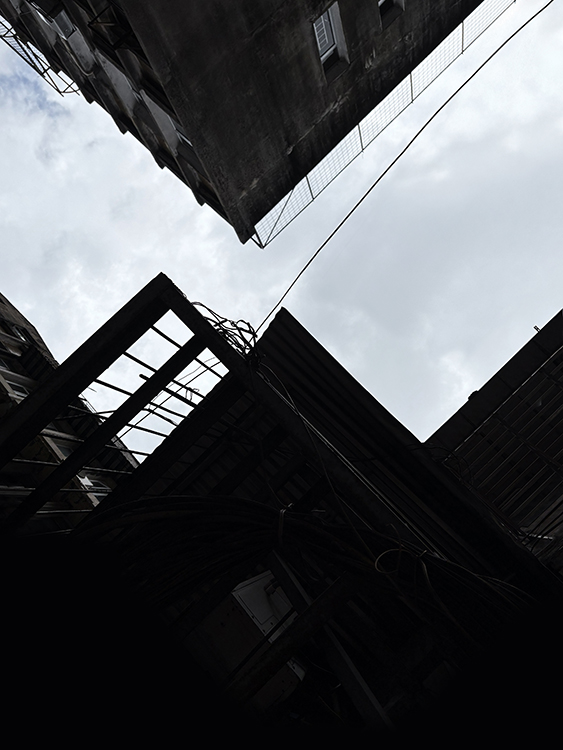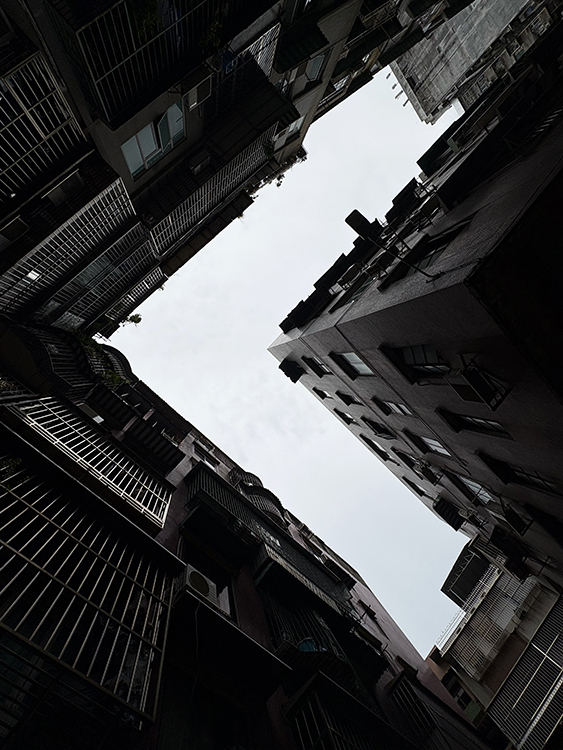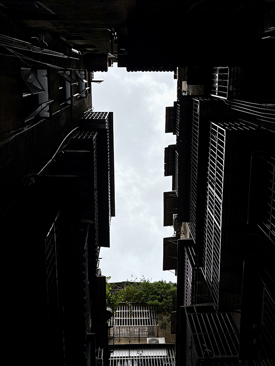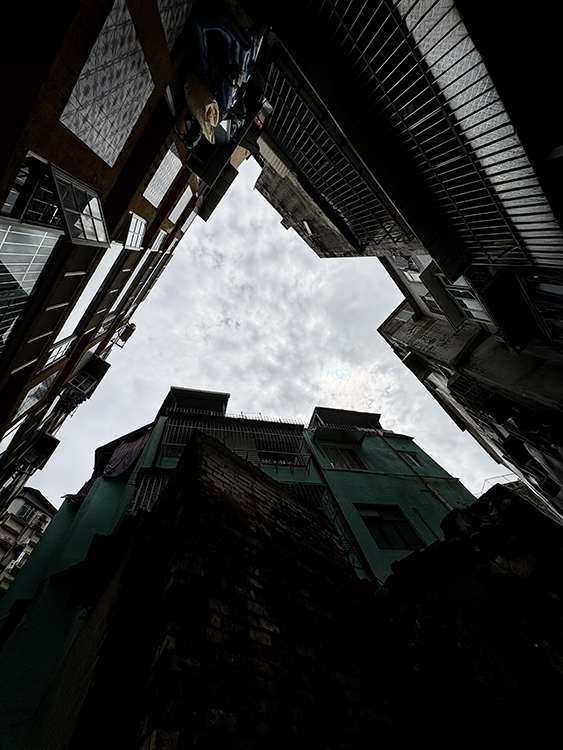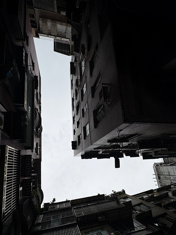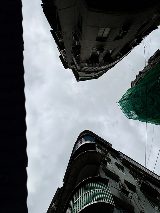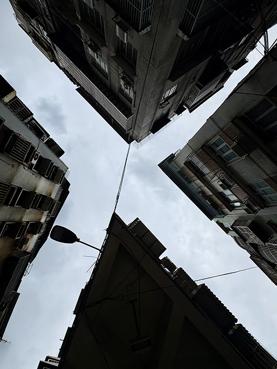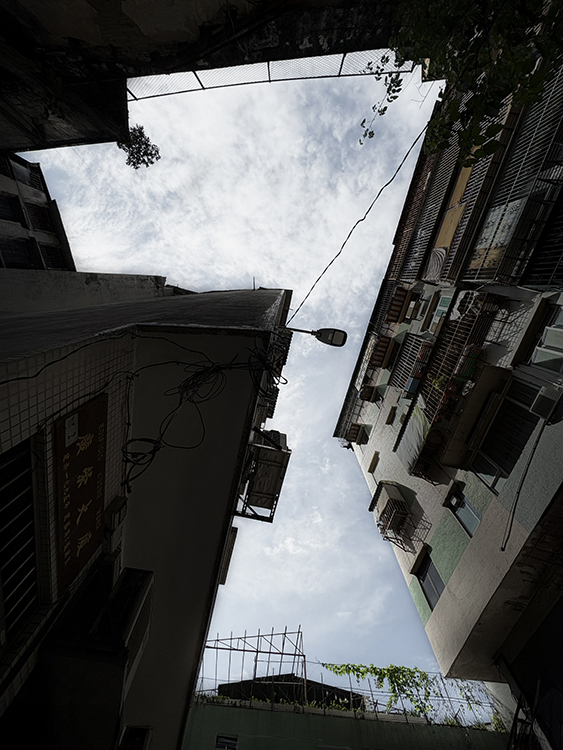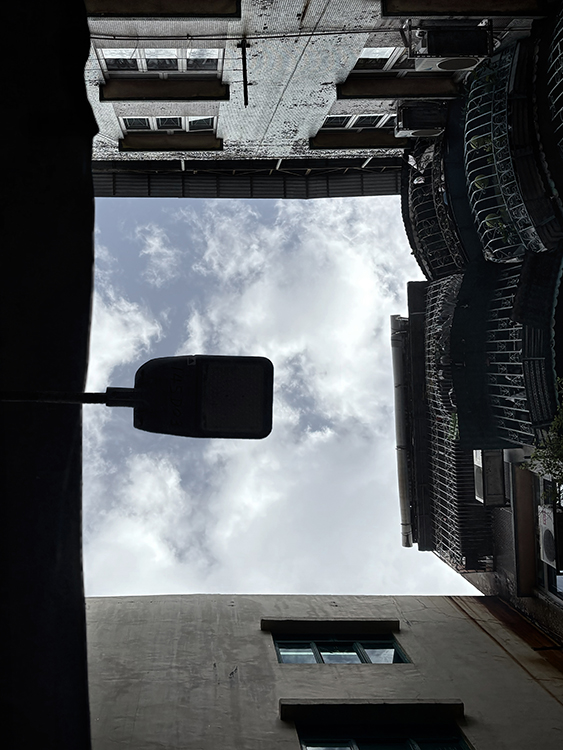 Durante la residencia artística realizada en el verano de 2026 en Macau, China, el autor se sumergió en el denso tejido urbano de la zona antigua, un enclave donde la herencia colonial portuguesa y la tradición china convergen en una arquitectura laberíntica. En este espacio histórico, declarado Patrimonio de la Humanidad, la convivencia entre las fachadas desgastadas, con sus caraterísticas rejas, y la vibrante actividad cotidiana genera una atmósfera de compresión espacial única. Fue precisamente en la observación de estas calles estrechas de la zona vieja donde surgió la inspiración para capturar la esencia de la ciudad, no a través de sus muros, sino del recorte que éstos proyectan sobre el cielo de la ciudad.