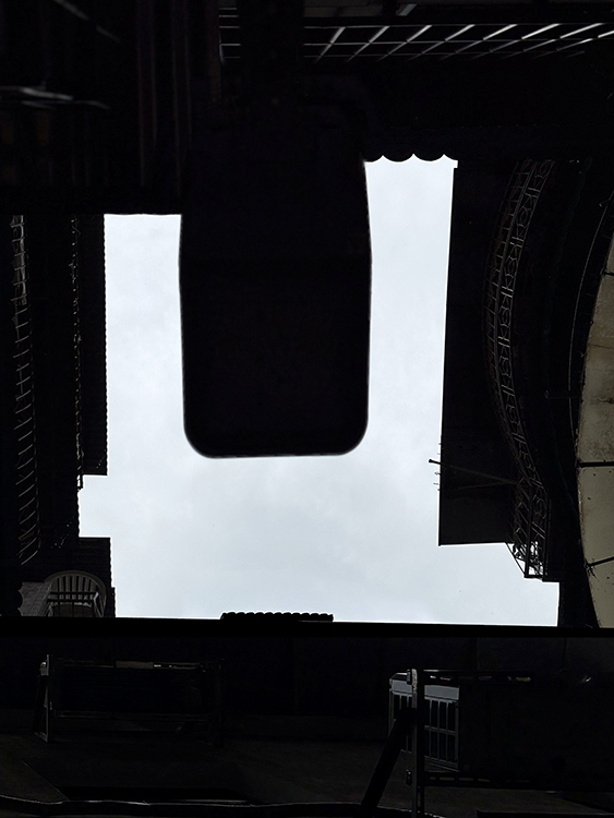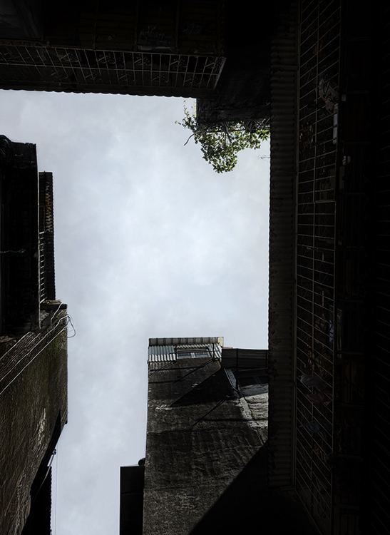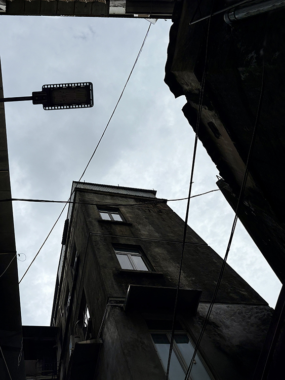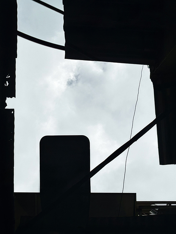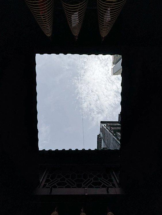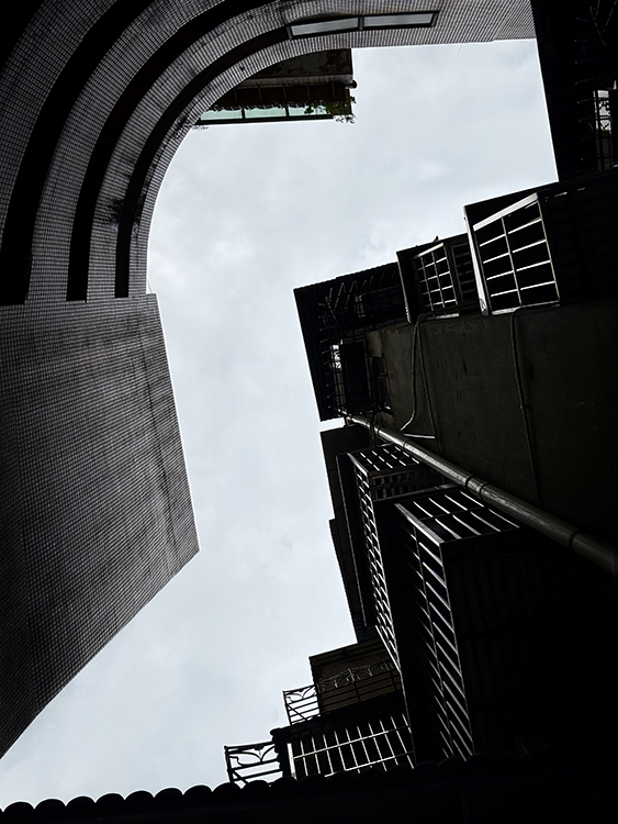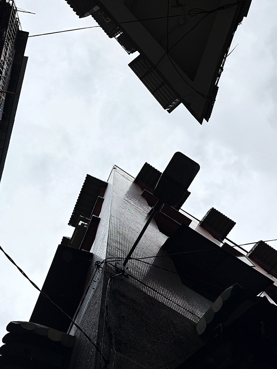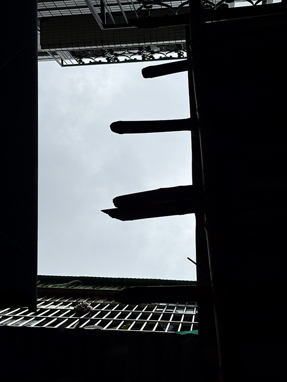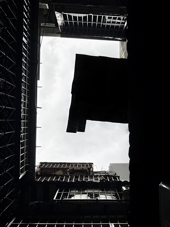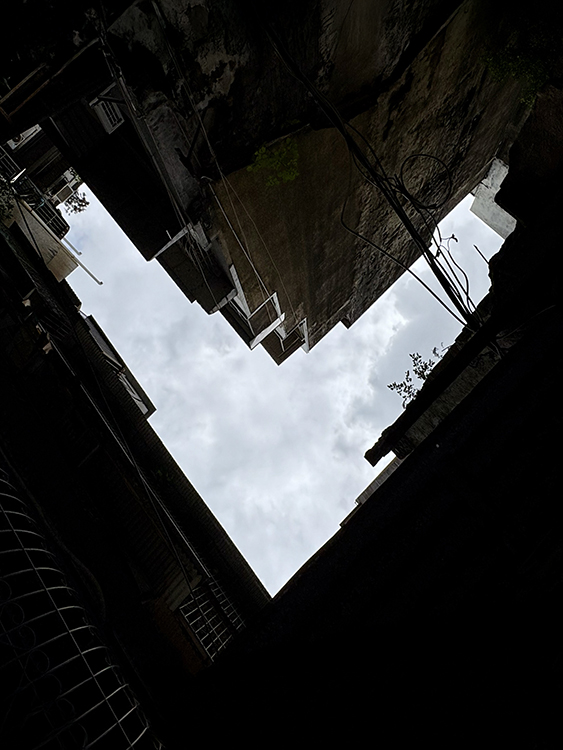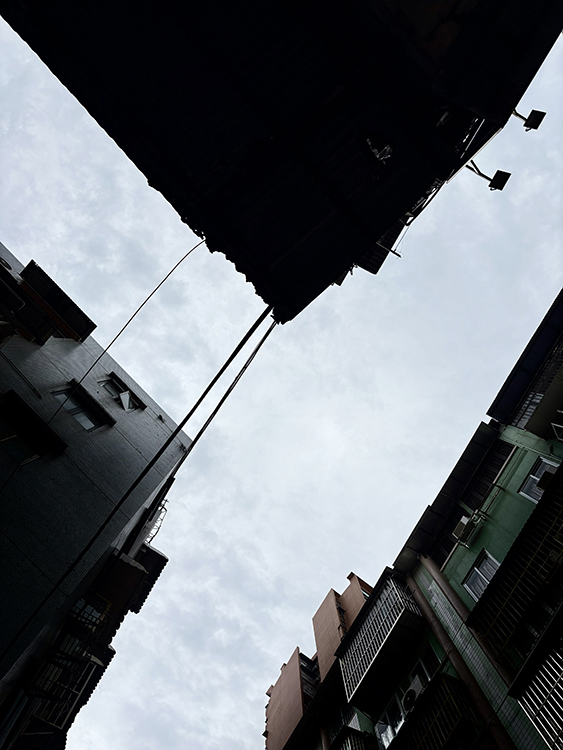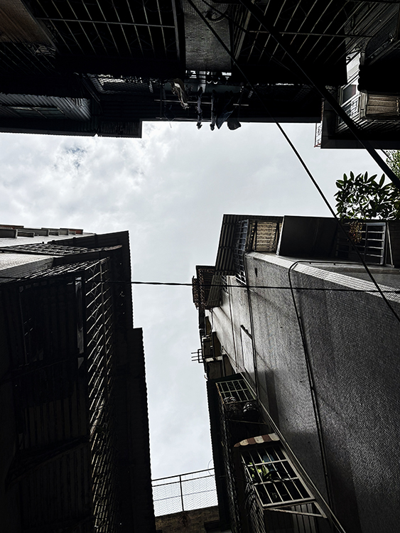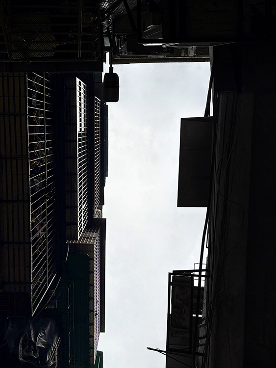 Durante la residencia artística realizada en el verano de 2026 en Macau, China, el autor se sumergió en el denso tejido urbano de la zona antigua, un enclave donde la herencia colonial portuguesa y la tradición china convergen en una arquitectura laberíntica. En este espacio histórico, declarado Patrimonio de la Humanidad, la convivencia entre las fachadas desgastadas, con sus caraterísticas rejas, y la vibrante actividad cotidiana genera una atmósfera de compresión espacial única. Fue precisamente en la observación de estas calles estrechas de la zona vieja donde surgió la inspiración para capturar la esencia de la ciudad, no a través de sus muros, sino del recorte que éstos proyectan sobre el cielo de la ciudad.